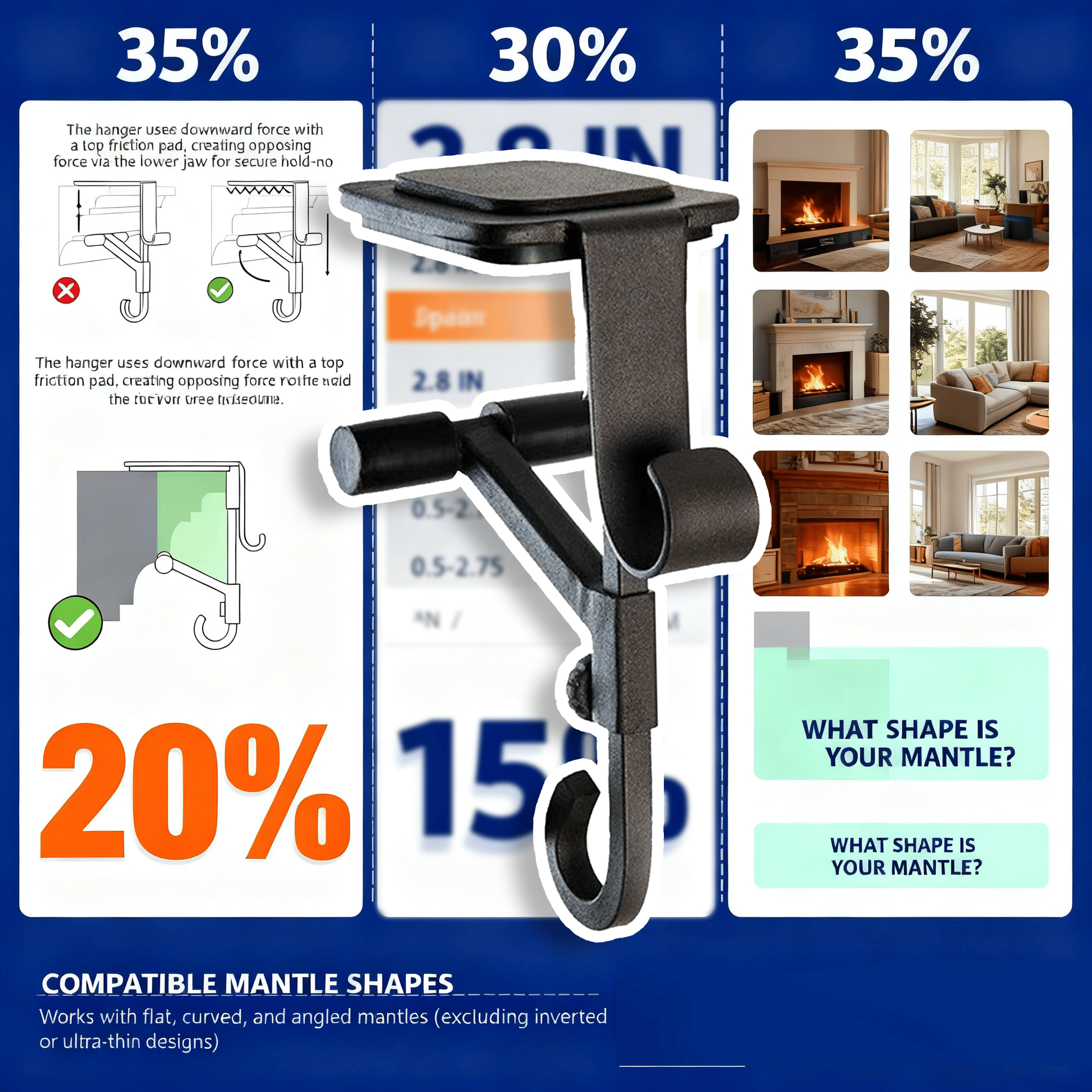 - [ADJUSTABLE HEIGHT] - Adjust to fit mantles up to 8.5 inches thick