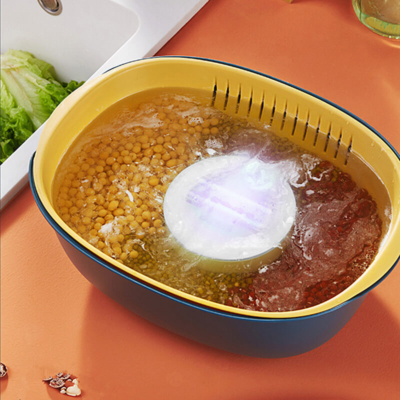 Our IPX7 waterproof fruit and vegetable washing machine deep cleans your fruits and vegetables in just 5 minutes! Simply turn it on, put the fruit cleaner device in water, and wait until the blue light turns off. Once it is off, you can quickly rinse the produce before eating.