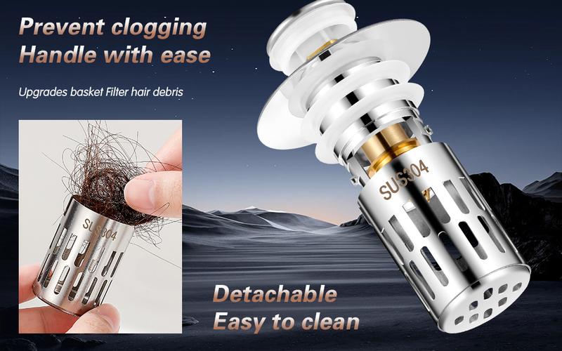 Unlike regular push-button drain, this drain stopper has an anti-clogging basket strainer inside that neatly collects hairs and prevents the drain from clogging. No jewelry, rings, dirt, and other things will enter the drain pipe.
